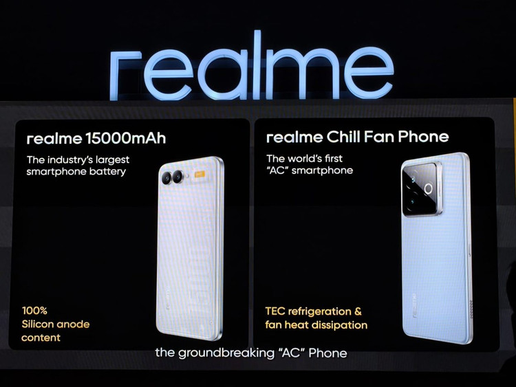 Thiết bị còn lại là “Chill Fan Phone” – chiếc smartphone đầu tiên trên thế giới được trang bị công nghệ làm mát AC Cooling. Khác với quạt thông gió vốn quen thuộc trên các dòng gaming phone, hệ thống AC Cooling của realme được quảng bá như “mini điều hòa” bên trong điện thoại.