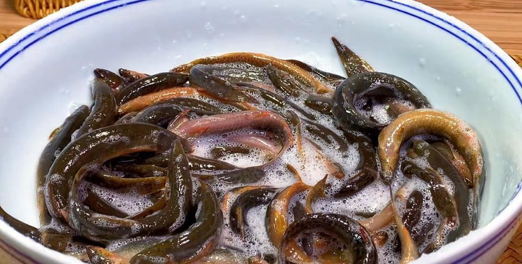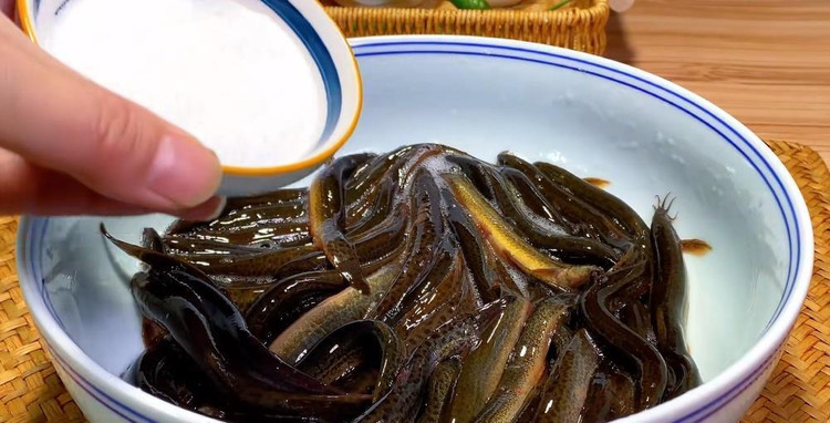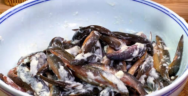 - Đổ 50 gram bột mì vào, dùng tay trộn đều bột mì và cá chạch. Bột mì có khả năng hấp phụ mạnh và có thể hút chất nhầy trên bề mặt cá chạch.