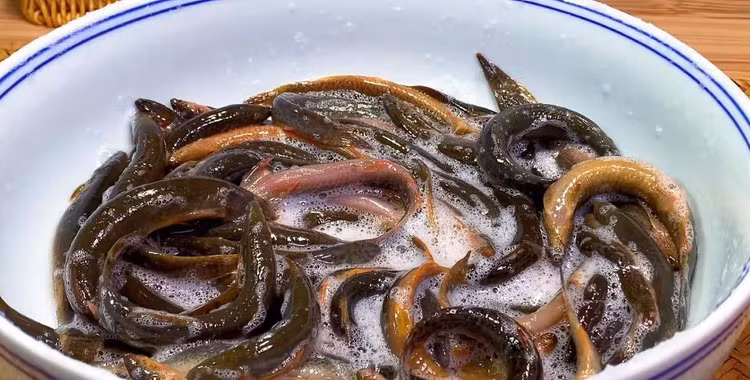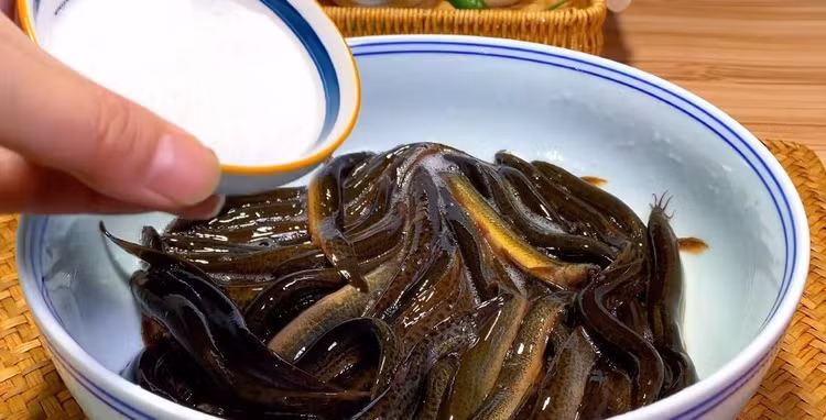 - Cá chạch sau khi mua về, cho vào tô lớn, thêm 50 gam muối, đậy nắp nhanh chóng rồi dùng muối làm choáng cá chạch.
