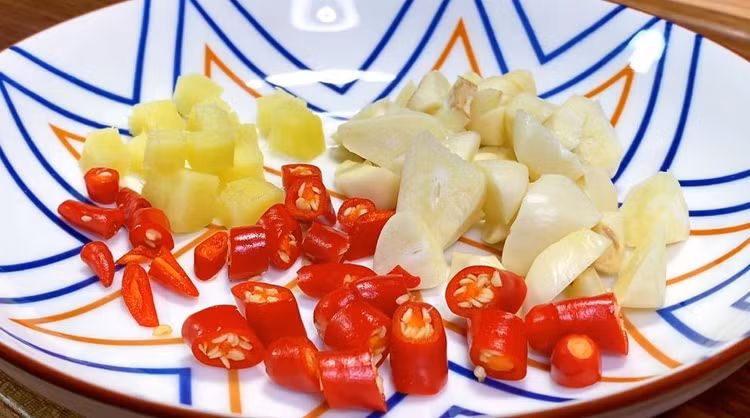 - Chuẩn bị một số nguyên liệu, tỏi băm nhỏ, gừng gọt vỏ và thái hạt lựu, ớt cay khúc ngắn.