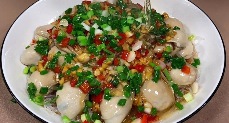 - Trải bún dưới đáy đĩa, sau đó xếp từng con hàu vào, rưới nước sốt đã chuẩn bị sẵn lên trên rồi, rắc hành lá xắt nhỏ, cho dầu nóng vào để tăng hương vị là bạn đã sẵn sàng thưởng thức.