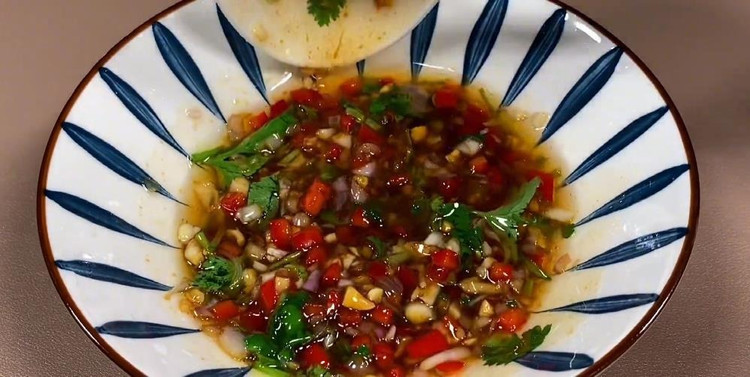 - Làm nước sốt: Cho tỏi băm, hành lá băm, ớt đỏ vào tô, đổ dầu nóng vào để dậy mùi thơm, sau đó cho rau mùi, nước tương nhạt, dầu hào, dầu hàu vào khuấy đều.