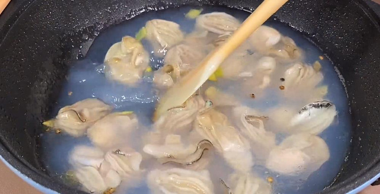 - Đun nóng dầu trong chảo, cho hạt tiêu và gừng lát vào xào thơm thì cho nước sôi vào đun trên lửa lớn khoảng 3 phút thì tắt bếp, cho hàu vào đảo đều và ngâm khoảng 5 phút.