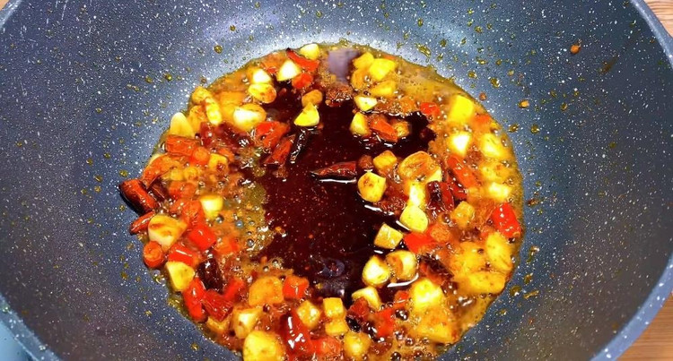 - Lấy 1 chảo khác, cho ít dầu vào chảo, đun nóng rồi đổ gừng, ớt cay tươi, ớt khô, tỏi vào xào thơm, thêm một thìa bột đậu tempeh vào, xào cho đến khi ra dầu đỏ thì đổ nước sốt đã chuẩn bị vào đun cho đến khi có mùi thơm.