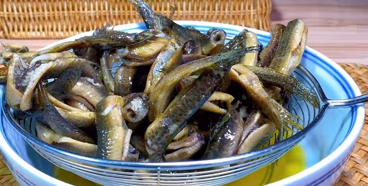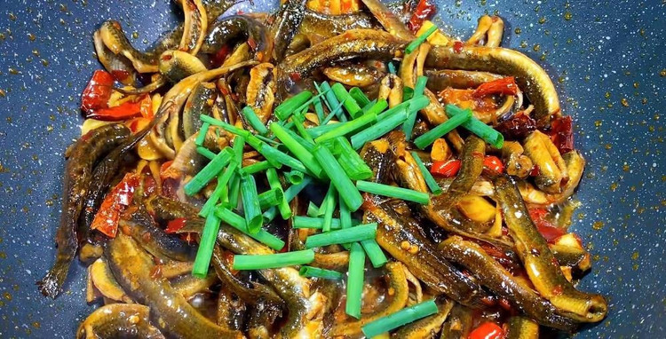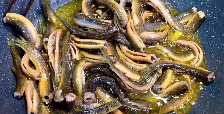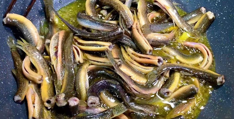 - Đổ dầu vào chảo, đun nóng dầu khoảng 50%, đổ cá chạch vào, vặn lửa nhỏ chiên từ từ trong 2 phút, chiên đến khi mặt hơi vàng thì vớt ra khỏi chảo.