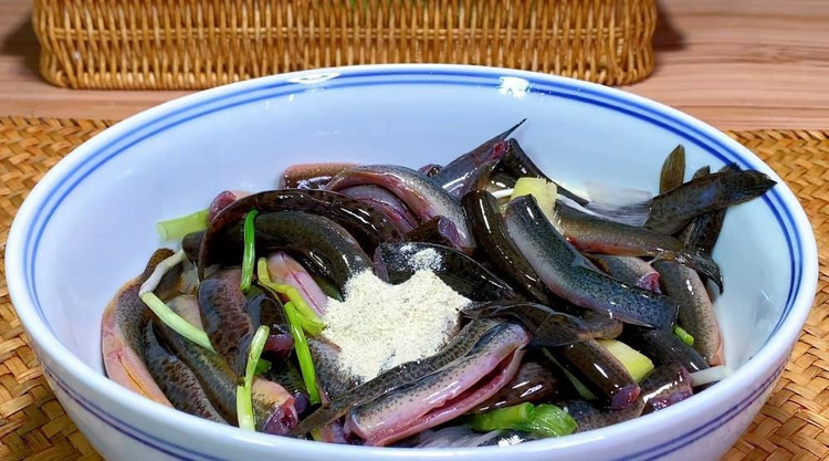 - Cá chạch rửa sạch, bỏ ruột, cắt bỏ đầu, đuôi, cho vào tô, thêm vài lát gừng, một nắm hành lá, một thìa hạt tiêu vào trộn đều rồi để riêng khoảng 10 phút.