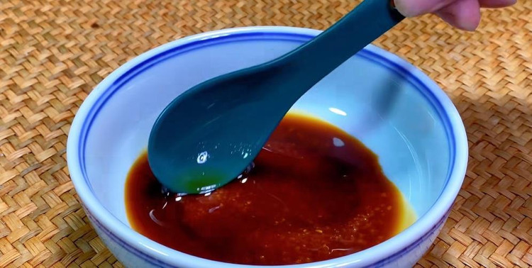 -. Cho 2 thìa nước tương nhạt, một thìa muối, một thìa nước cốt gà, một thìa đường và một thìa giấm vào tô, khuấy đều.