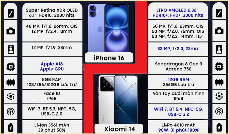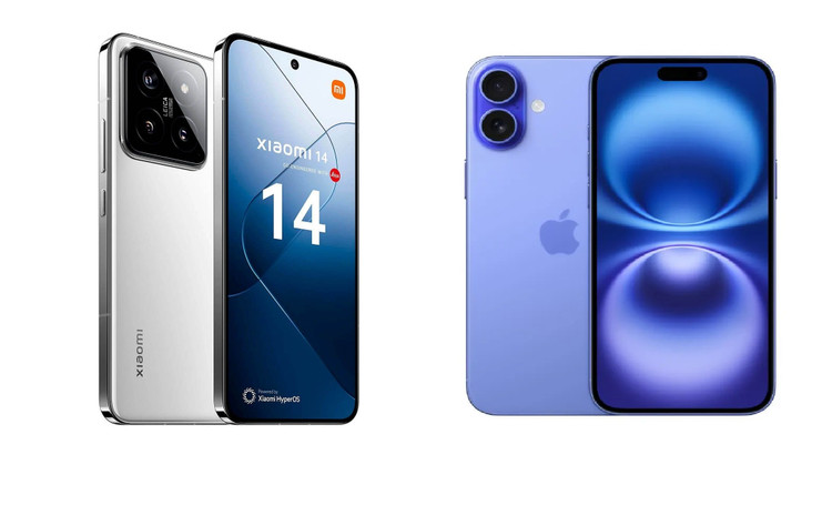 Trong khi đó, Xiaomi 14 được đi kèm với 3 camera linh hoạt hơn và được Leica hậu thuẫn. Camera chính độ phân giải 50MP, khẩu độ f/1.6, tiêu cự 23mm, công nghệ dual pixel, hỗ trợ PDAF, lấy nét bằng Laser AF và chống rung OIS. Camera tele độ phân giải 50MP, khẩu f/2.0, tiêu cự 75mm, PDAF (10cm - ∞), OIS, zoom quang học 3.2x. Camera góc siêu rộng độ phân giải 50MP, khẩu độ f/2.2, tiêu cự 14mm, góc nhìn 115˚, Xiaomi hỗ trợ quay video 8K trên sản phẩm. Camera selfie có độ phân giải cao hơn so với iPhone 16 với 32 MP.