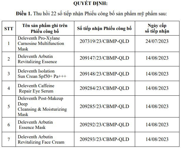 Trong 22 sản phẩm này, có 1 sản phẩm Deleventh Pro-Xylane Carnosine Multifunction Mask (mặt nạ dưỡng ẩm) được Cục Quản lý dược cấp số tiếp nhận phiếu công bố sản phẩm mỹ phẩm hôm 24/7; 21 sản phẩm còn lại vừa được cấp ngày 14/8.