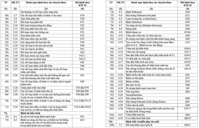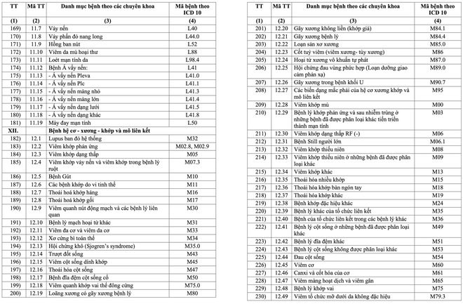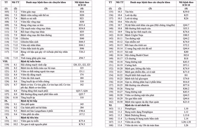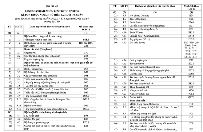 Trong danh mục do Bộ Y tế ban hành, có tổng cộng 252 bệnh được áp dụng kê đơn thuốc ngoại trú trên 30 ngày, thuộc 16 chuyên khoa như: Ung thư, bệnh về máu, bệnh nội tiết, dinh dưỡng và chuyển hóa, bệnh tâm thần, bệnh hệ thần kinh, tuần hoàn, hô hấp, tiêu hóa, da, bệnh hệ cơ - xương - khớp và mô liên kết, bệnh về ký sinh trùng…