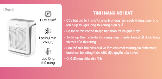 Máy lọc không khí Levoit Vital 100S là lựa chọn tuyệt vời cho những ai đang tìm kiếm một thiết bị có khả năng loại bỏ ô nhiễm không khí hiệu quả, đặc biệt là từ lông và mùi của thú cưng. Sản phẩm này được trang bị hệ thống lọc 3 lớp, bao gồm bộ lọc trước để chặn lông thú và lớp lọc HEPA giúp loại bỏ 99.97% các hạt bụi mịn và các chất gây dị ứng như phấn hoa, bụi nhà, và lông thú cưng. Lớp lọc carbon hoạt tính có khả năng hấp thụ mùi và khí độc hại, giúp không khí trong nhà luôn tươi mới và sạch sẽ.