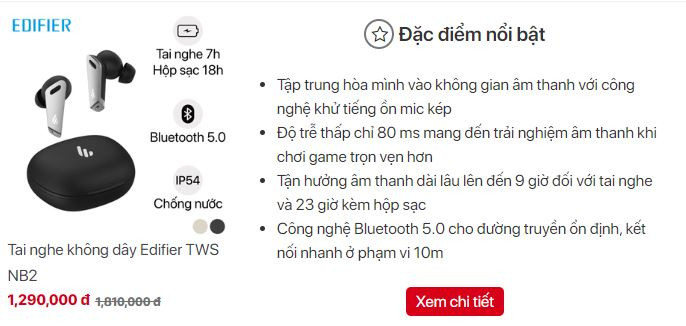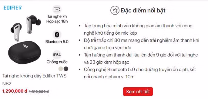 Dù không sở hữu dung lượng pin dài như Oppo Enco Buds 2 nhưng Edifier TWS NB2 mang đến tính năng khử tiếng ồn micro kép, cùng tính năng chống nước IP54 nổi trội so với các tai nghe cùng phân khúc. Ngoài ra, mẫu tai nghe này cũng sử dụng công nghệ Bluetooth 5.0 cho đường truyền ổn định, kết nối nhanh ở phạm vi 10m nhưng vẫn giữ được chất lượng âm thanh cực kỳ ấn tượng. Đặc biệt, sản phẩm tích hợp chế độ Game Mode, giảm độ trễ xuống còn 80 ms/ giây. Tai nghe này có thể hoạt động độc lập, khi một chiếc tai nghe cần sạc thì bên còn lại vẫn có thể sử dụng, và tự động chuyển đổi giữa các chế độ rất mượt mà. Mẫu tai nghe Edifier TWS NB2 có giá từ 1,29 triệu đồng./.