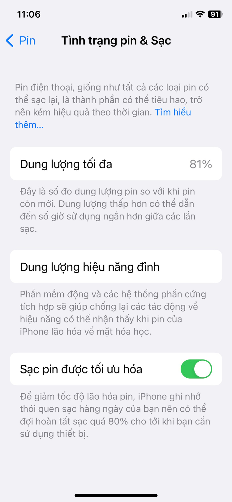 Tình trạng pin cũng là một yếu tố quan trọng ảnh hưởng đến hoạt động của iPhone. Khi thiết bị cũ, pin của chúng dần mất khả năng sạc đầy, dẫn đến cạn kiệt nhanh hơn, tắt máy đột ngột hoặc gây ra sự cố nghiêm trọng. Nhận biết tình trạng pin có thể ngăn chặn sự cố, duy trì hiệu suất và kéo dài tuổi thọ cho iPhone. Để kiểm tra, bạn vào Settings > Battery > Battery Health & Charging (Cài đặt > Pin > Tình trạng pin & Sạc). Mục này sẽ cung cấp thông tin dung lượng pin tối đa và khả năng đặt hiệu suất cao nhất của iPhone. Trong trường hợp nhận được thông báo dung lượng đã giảm mạnh và máy không đạt hiệu năng đỉnh thông thường, người dùng nên cân nhắc thay pin mới.