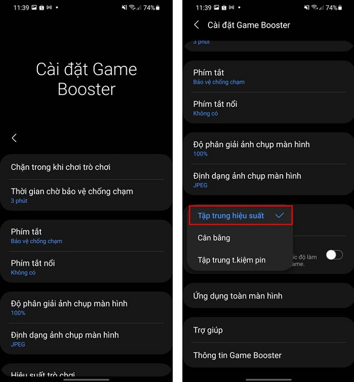 Vào phần Cài đặt -> chọn mục Game Booster -> chọn mục Hiệu suất trò chơi -> Kích hoạt Tập trung hiệu suất.