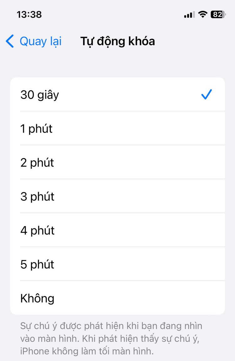 Việc để màn hình điện thoại luôn sáng sẽ tiêu thụ pin điện thoại khiến thiết bị bị hao pin, làm giảm tuổi thọ pin điện thoại, hơn nữa, điện thoại luôn bị nóng dẫn đến tình trạng pin điện thoại bị nổ, hay tình trạng chập điện khi đang sạc thiết bị. Vì vậy, hãy đặt chế độ tự động khoá sao cho ngắn nhất có thể để giảm thiểu điều này. Bạn có thể vào Cài đặt > Cài đặt chung > Tự động khoá > Chọn thời gian ngắn nhất (tùy vào từng dòng điện thoại mà thời gian chờ ngắn nhất dao động từ 10 đến 30 giây).