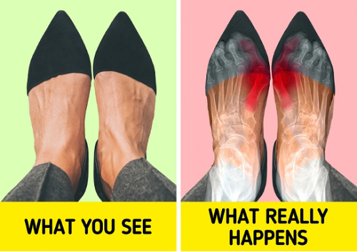 Đi giày mũi nhọn. Giày mũi nhọn khiến vẻ ngoài của bạn đẹp nhưng lại làm hỏng cấu trúc chân bên trong. Ngón chân không được giữ ở vị trí tự nhiên khiến bạn sẽ nhận loạt tác dụng phụ như ngón chân hình búa, hình thành vết chai. Kiểu giày này cũng làm tăng nguy cơ viêm dây thần kinh, chủ yếu là giữa ngón chân thứ ba và thứ tư.