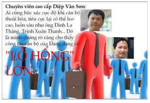 “Thời gian vừa qua, báo chí, dư luận đã chỉ mặt, đặt tên rõ hiện tượng “cả họ làm quan” diễn ra ở tất cả các cấp, các ngành và nhiều địa phương. Nhân dân cũng đã từng thắc mắc “đúng quy trình” việc bổ nhiệm đề bạt ông Vũ Quang Hải, con trai bộ trưởng Bộ Công thương, hay vụ phó Vụ kinh tế Ban chỉ đạo Tây Nam Bộ Vũ Minh Hoàng (25 tuổi), việc bổ nhiệm 60 cán bộ của Thanh tra Nhà nước và 19 cán bộ của Sở VH-TT&DL TP.HCM ở phút 89 trước khi lãnh đạo nghỉ hưu… Ai cũng bức xúc cực độ khi cán bộ thoái hóa, tiêu cực lại có thể leo cao, luồn sâu như ông Đinh La Thăng, Trịnh Xuân Thanh… Đó là minh chứng rõ ràng cho thấy công tác cán bộ của Đảng đang có “lỗ hổng” lớn.” – Chuyên viên cao cấp Diệp Văn Sơn. tuoitre.vn ngày 10/12