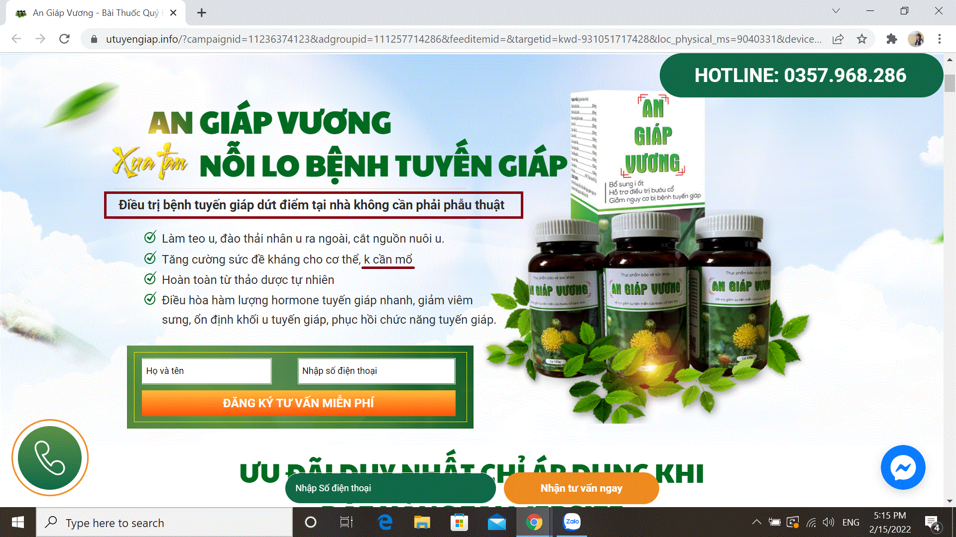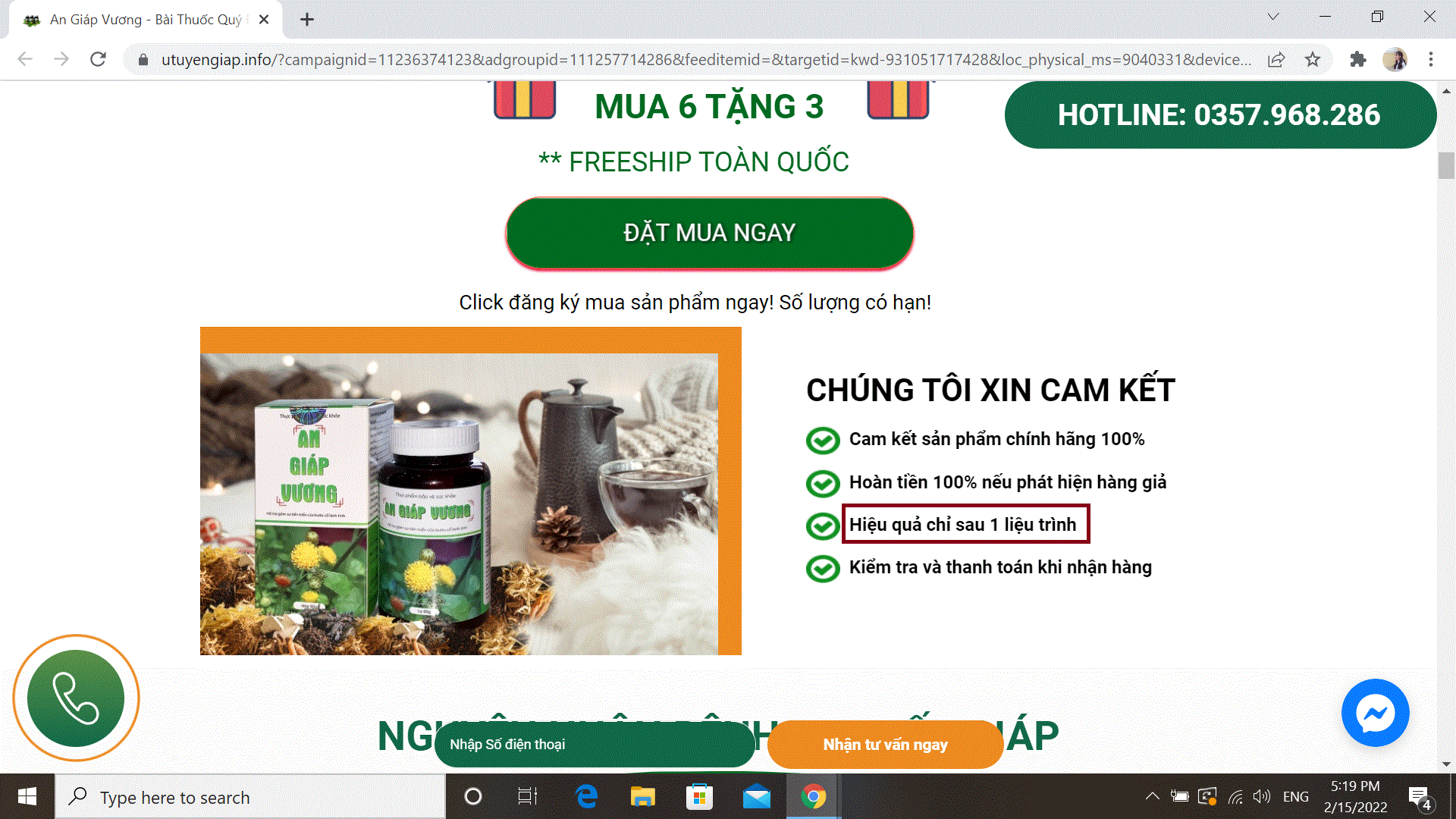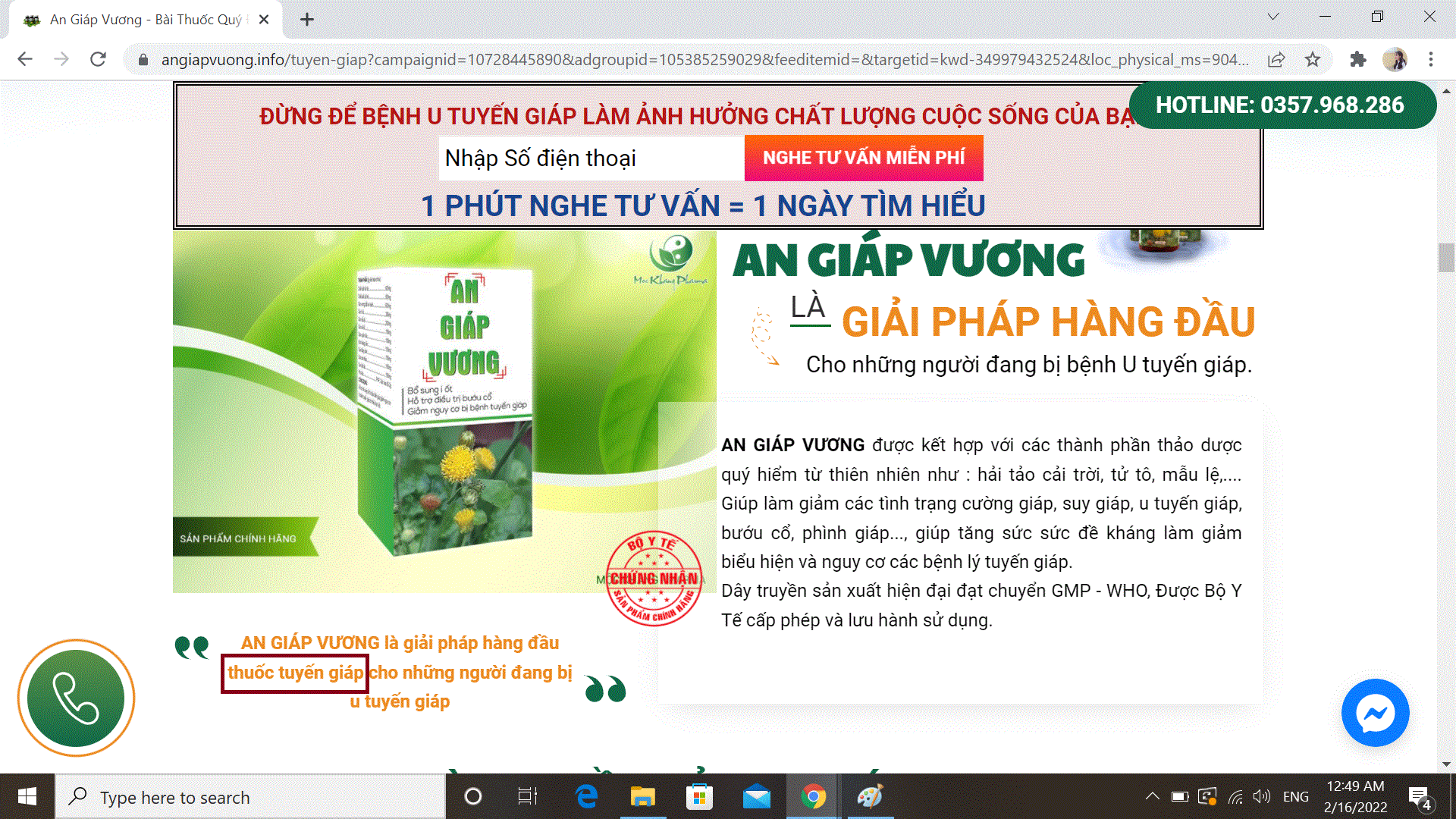 Cụ thể, tại website angiapvuong... sản phẩm An Giáp Vương mặc dù chỉ là TPBVSK nhưng lại đang được “nổ” với công dụng điều trị dứt điểm bệnh tuyến giáp giống một loại thuốc đặc trị. Phóng đại sự thật hơn nữa, sản phẩm này còn được quảng cáo như “thần dược” có khả năng chữa dứt điểm bệnh tuyến giáp ngay tại nhà mà chẳng cần trải qua phẫu thuật.