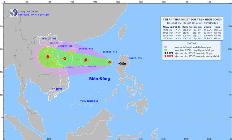 Trung tâm Dự báo Khí tượng thủy văn Quốc gia cho biết, vị trí tâm áp thấp nhiệt đới vào lúc 01h ngày 23/8 vào khoảng 17,1°N; 118,2°E, cách đặc khu Hoàng Sa khoảng 730km về phía Đông. Cường độ: cấp 7 (50–61km/h), giật cấp 9. Áp thấp nhiệt đới di chuyển theo hướng Tây Tây Bắc, tốc độ khoảng 25km/h.