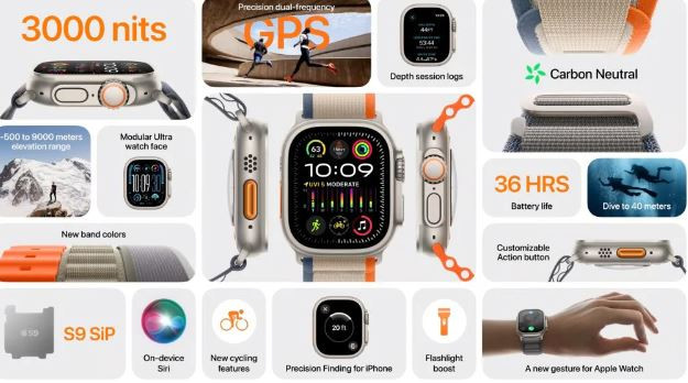 Apple Watch Ultra 2 sử dụng con chip SiP Apple S9 mới dựa trên Apple A15 từng xuất hiện trên iPhone 13 và 14 series. Chip mới được sản xuất trên tiến trình 5nm, hứa hẹn tăng mạnh mẽ hiệu suất hoạt động cũng như tiết kiệm pin hơn.