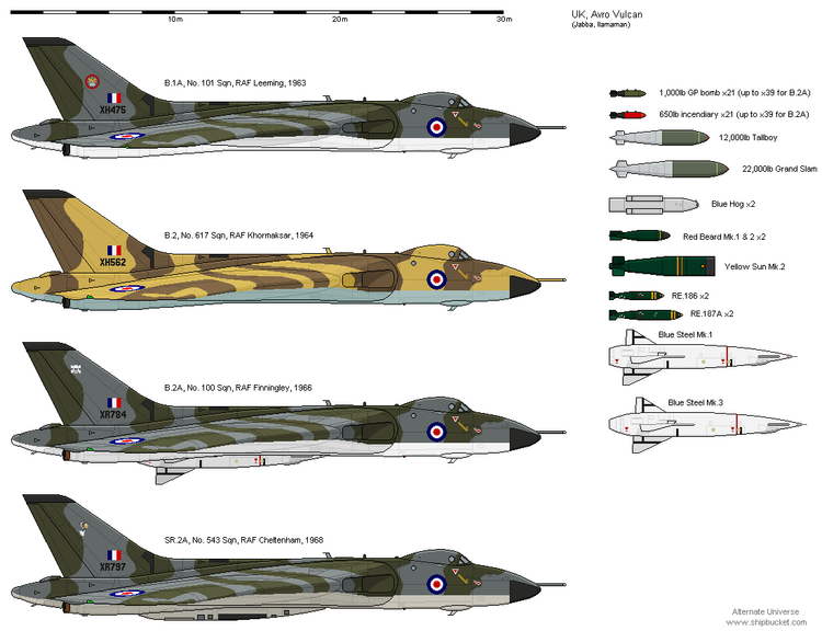 Ngoài ra máy bay ném bom Avro Vulcan có thể triển khai vũ khí hạt nhân khi cần thiết. Avro Vulcan cùng hai chiếc máy bay là Handley Page Victor và Vickers Valiant đã từng thực hiện vai trò răn đe hạt nhân của Không quân Hoàng gia Anh trong thời kỳ Chiến tranh Lạnh. Nó đã nhiều lần cất cánh với quả bom hạt nhân có tên là Yellow Sun.