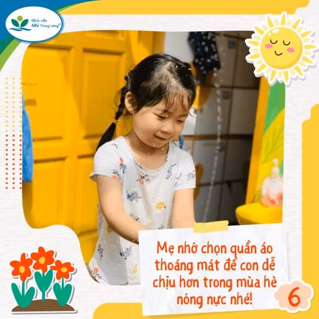 Có thể tăng số lần tắm cho con: Cha mẹ có thể tăng số lần tắm trong ngày lên thành 2-3 lần/ ngày thay vì 1 lần để giúp con thấy thoải mái. Khi nóng bức có thể cho bé tắm trước giờ ăn trưa, trước giờ ăn chiều và bất kể khi nào thấy con nóng nực quá, điều đó có thể giúp bé ăn ngon miệng hơn, ngủ tốt hơn.