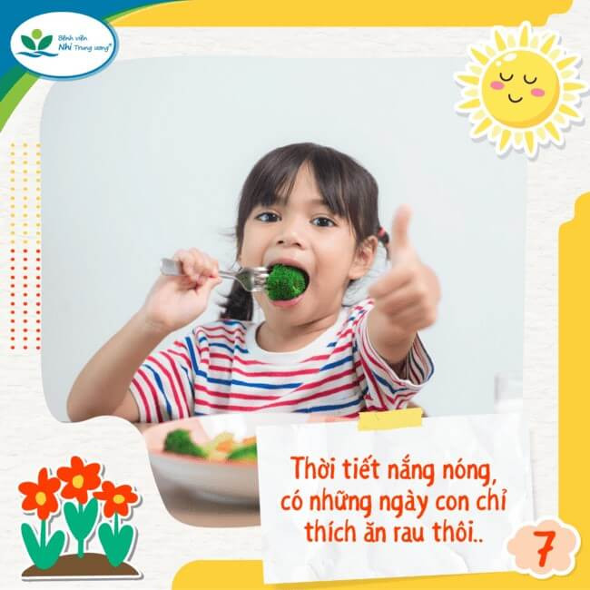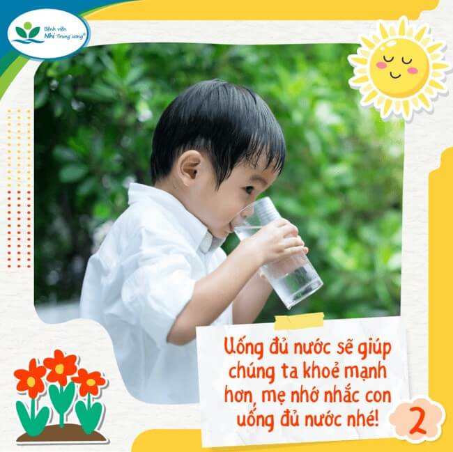 Tạo nhiều cơ hội cho con uống nước: Trong thời tiết nắng nóng, cơ thể các bé bị mất nước do đổ nhiều mồ hôi. Cha mẹ hãy tạo nhiều cơ hội cho con uống nước bằng cách: Để nước ở tầm thấp để con dễ lấy, thường xuyên đặt câu hỏi “Con có muốn uống nước không?”