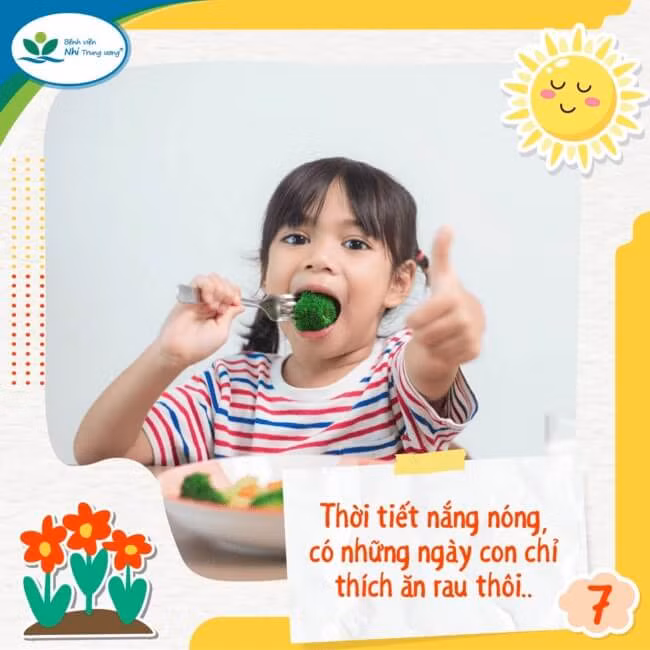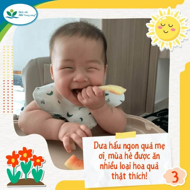 Hãy lắng nghe cơ thể bé và tôn trọng lựa chọn của con khi ăn dặm: Thời tiết nắng nóng đôi khi có thể khiến bé ăn kém hơn, hoặc có những ngày chỉ thích ăn hoa quả và rau. Cha mẹ hãy lắng nghe cơ thể bé và tôn trọng lựa chọn của con. Điều cha mẹ cần làm là theo dõi sát và đảm bảo con được cung cấp đủ nước để không rơi vào tình trạng mất nước. Bé sẽ ăn trả bữa trong những ngày tiếp theo.