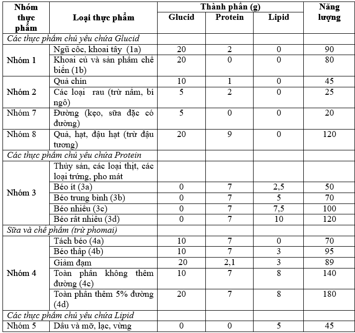 Với các thực phẩm cùng nhóm thì dù là loại thực phẩm nào, thành phần chất dinh dưỡng cũng như lượng năng lượng chứa trong 1 đơn vị thực phẩm cũng sẽ tương đương nhau. Do đó có thể chuyển đổi giữa các thực phẩm đó cho nhau.