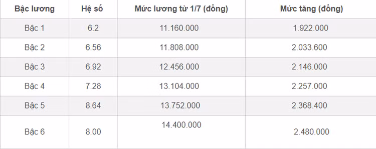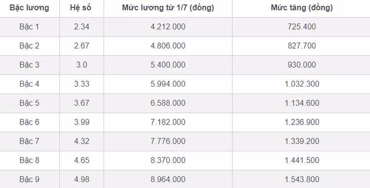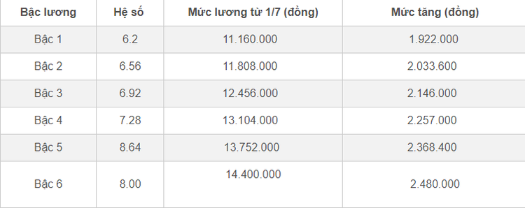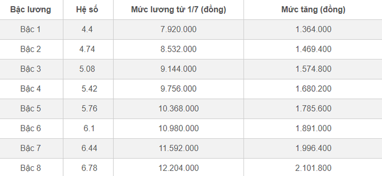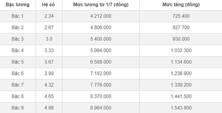 Từ hộm nay (1/7), khi mức lương cơ sở mới được áp dụng, tăng từ 1,49 triệu đồng lên 1,8 triệu đồng, bảng lương của bác sỹ cũng sẽ thay đổi. Cụ thể: