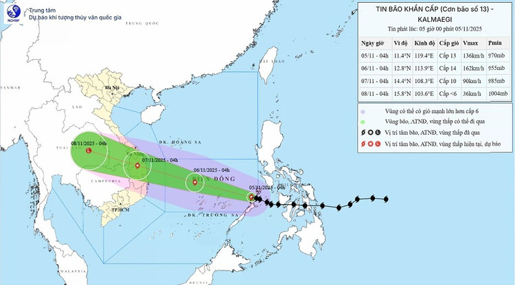 Dự báo đến 4 giờ ngày 6/11, bão số 13 tiếp tục di chuyển theo hướng Tây Tây Bắc, tốc độ khoảng 25km/h, cách bờ biển tỉnh Gia Lai khoảng 550km về phía Đông Đông Nam và có khả năng mạnh thêm, với gió mạnh nhất vùng gần tâm bão cấp 14, giật cấp 17. Cảnh báo rủi ro thiên tai cấp 4 được đưa ra cho khu vực giữa Biển Đông, bao gồm vùng biển phía Bắc đặc khu Trường Sa. Đến 4 giờ ngày 7/11, bão Kalmaegi sẽ tiến vào đất liền từ Quảng Ngãi đến Đắk Lắk và suy yếu dần, sức gió vùng gần tâm bão còn cấp 9-10, giật cấp 12.
