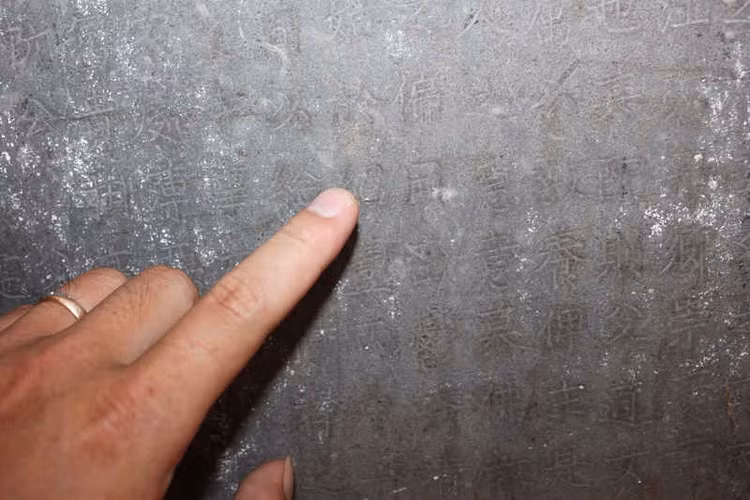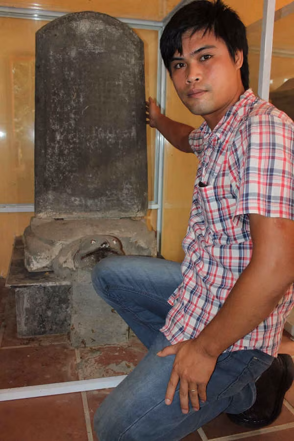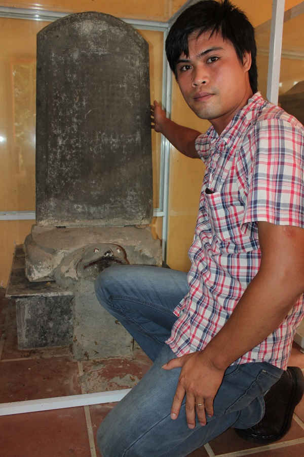 Khách đến, anh đưa ra xem văn bia. Văn bia bị sờ nhiều đến độ mòn chữ. Người ta phải làm tủ kính, đặt văn bia vào trong nên những chữ nghĩa càng khó đọc. Nể ai, anh mới lấy khóa mở tủ, chỉ tay vào từng dòng mà đọc.