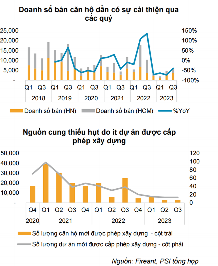 Trong khi đó, phân tích ngành bất động sản, Chứng khoán Dầu khí (PSI) cũng cho rằng nhu cầu mua nhà dần quay trở lại qua từng quý. Dù tâm lý người mua nhà vẫn còn yếu trong bối cảnh kinh tế suy thoái và sự phục hồi của thị trường bất động sản chưa chắc chắn, tuy nhiên các thống kê cho thấy, doanh số bán căn hộ trong quý 3.2023 tại Hà Nội và Tp. Hồ Chí Minh tăng lần lượt 67% và 125% so với quý 4.2022.