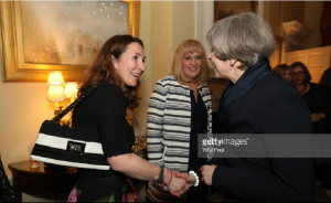 Thủ tướng May chào đón Caroline Haughey (trái) tới dự sự kiện kỷ niệm ngày 8/3 tại số 10 Phố Dowing hồi năm 2017. Ảnh: Getty.
