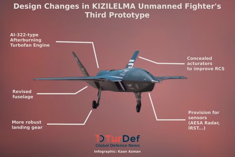 Bayraktar Kizilelma là máy bay chiến đấu không người lái có thể hoạt động độc lập hoặc kết hợp với tiêm kích KAAN thế hệ thứ năm của Thổ Nhĩ Kỳ.
