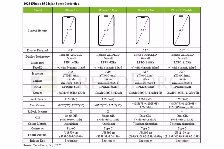 Với tư cách là "nhà cung cấp thông tin thị trường hàng đầu thế giới", mới đây, hãng TrendForce đã công bố một bảng so sánh tất các chi tiết quan trọng và đáng tin cậy nhất của iPhone 15, 15 Plus, 15 Pro và 15 Pro Max để người dùng cũng như các chuyên gia có cái nhìn rõ hơn về thiết bị cầm tay sắp ra mắt của Apple. Tất nhiên, đây vẫn chỉ là những dự đoán dựa trên tin đồn kéo dài vài tháng qua từ hàng chục nguồn tin khác nhau, điều đó có nghĩa là nhiều chi tiết vẫn có thể thay đổi cho đến khi Apple chính thức ra mắt dòng iPhone mới vào thứ Ba tuần tới.