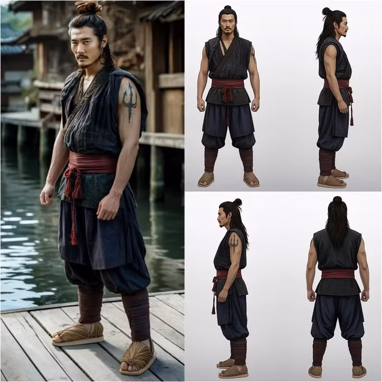 Tính năng đảo góc nhân vật 4 chiều tạo ra một bức tranh bốn tấm để thể hiện mặt trước, mặt phải, mặt trái và lưng của nhân vật trên nền trắng và xám.