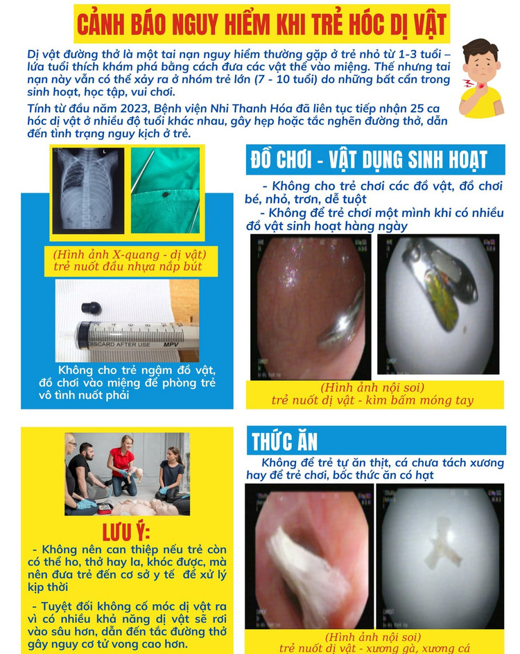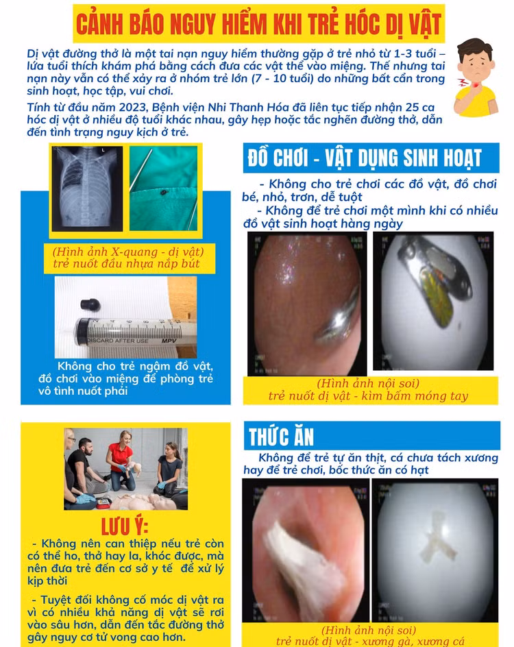 Thời gian gần đây, Bệnh viện Nhi Thanh Hóa tiếp nhận rất nhiều ca bệnh trẻ hóc dị vật, có những ca bệnh đã để lại hậu quả rất nặng nề. Đây cũng là lời cảnh báo cho các bậc phụ huynh có con nhỏ. Cần lưu tâm sát sao, không cho trẻ ăn các loại thực phẩm dễ gây hóc, không có nguồn gốc rõ ràng.