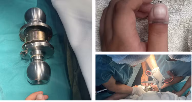 Theo Bệnh viện Chấn thương Chỉnh hình TP HCM, chiều ngày 18/12, bé trai (5 tuổi) nghịch ngợm tự đưa tay vào ổ khóa và bị kẹt ngón cái tay trái vào ổ khóa tại nhà.