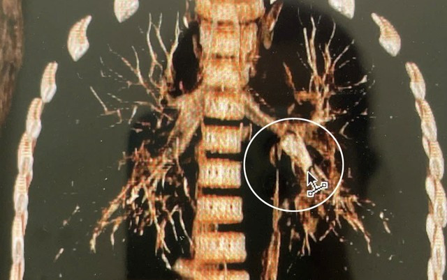 Qua thăm khám lâm sàng, các bác sĩ nghi ngờ trẻ bị hóc dị vật đường hô hấp. Kết quả chụp CT ngực ghi nhận dị vật hình ống, thành dày khoảng 1,8 mm, dài khoảng 18 mm, nằm tại phế quản thùy dưới trái, gây cản trở thông khí.
