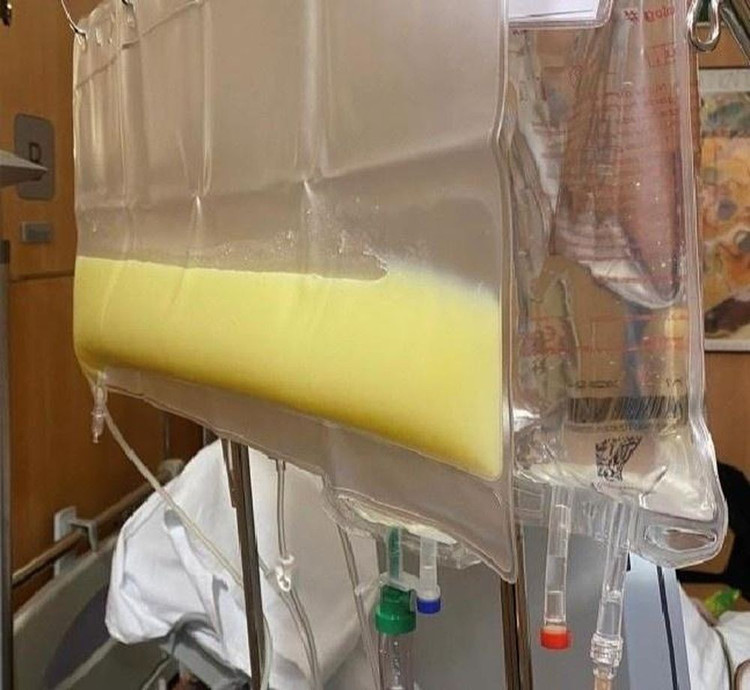 Túi huyết tương của bệnh nhân được thay ra sau lọc máu. Ảnh BVCC/nguồn Znews