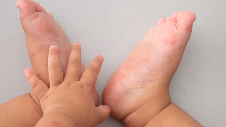 Bệnh tay chân miệng là một bệnh truyền nhiễm do vi-rút gây ra, có biểu hiện đặc trưng là sốt và mụn nước thường thấy xuất hiện tập trung ở lòng bàn tay, lòng bàn chân và ở bên trong miệng.