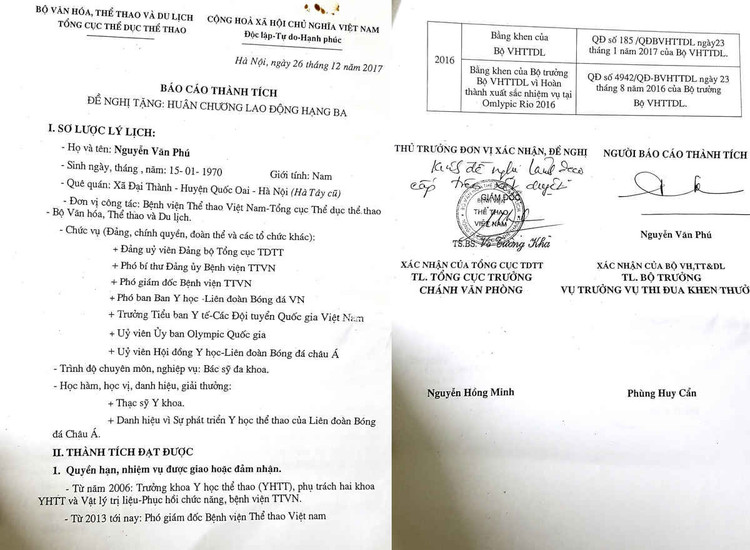 Được biết, trong suốt thời gian qua ông Phú luôn kê khai các thành tích. Ông được Đảng ủy bệnh viện TTVN và Tổng cục Thể dục Thể thao khen tặng danh hiệu Đảng viên hoàn thành xuất sắc nhiệm vụ. Cụ thể là ông đã được liên tục trong 3 năm và 5 năm liền.