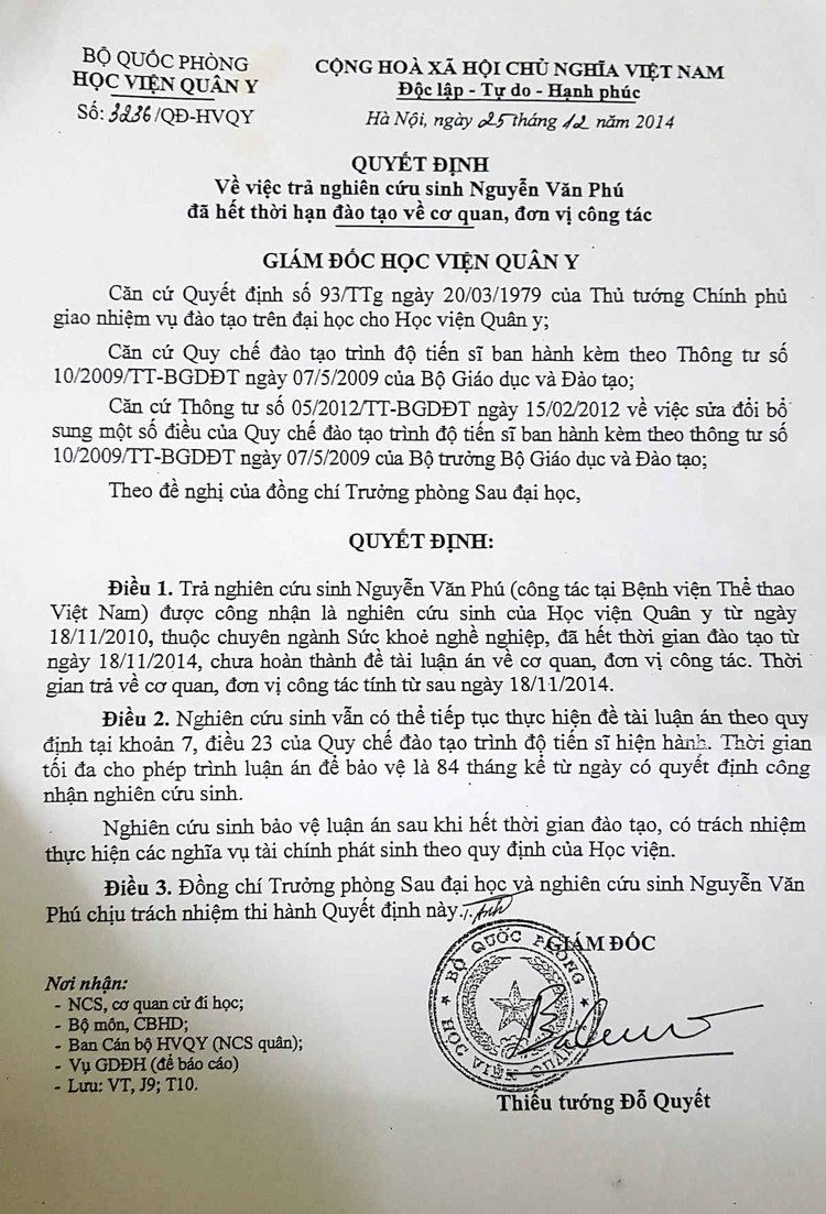 Đến tháng 12/2014, ông Phú vẫn chưa hoàn thành đề tài nghiên cứu. Ngày 25/12/2014, Học viện Quân Y đã ra Quyết định số 3236/QĐ-HVQY.