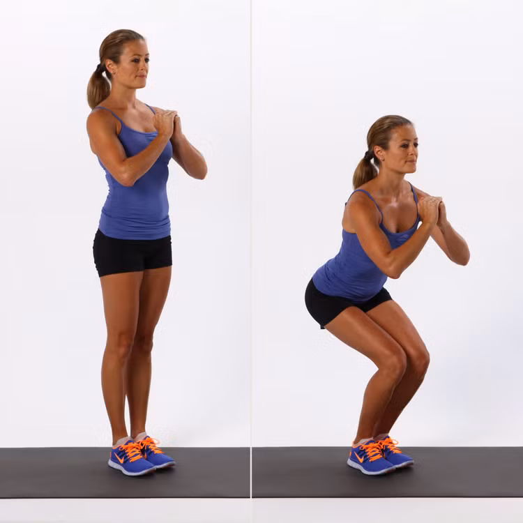 Thực hiện tư thế squat bằng cách khuỵu gối và đẩy mông về phía sau như thể ngồi xuống ghế, đồng thời ép chặt 2 chân vào nhau. Khi ở tư thế squat, trọng lượng cơ thể dồn vào hai gót chân.