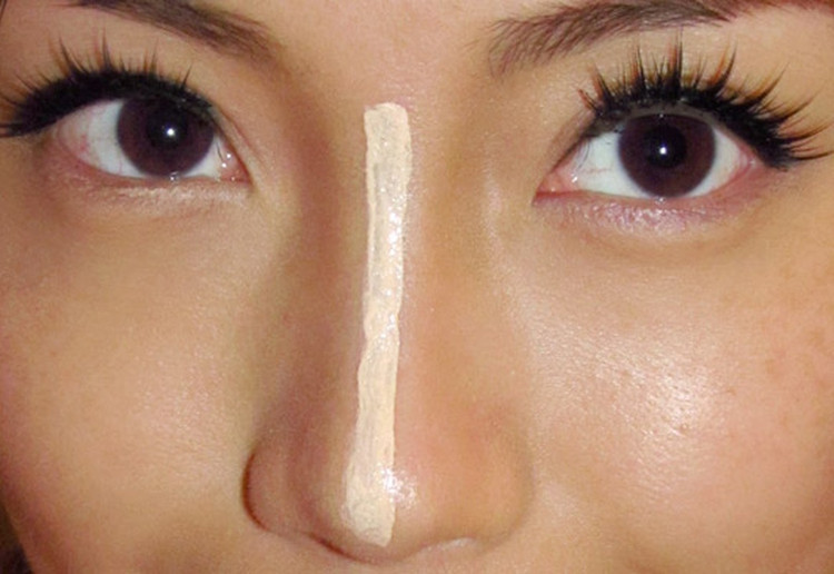 Để khắc phục nhược điểm mũi tẹt, cần làm cho hai bên cánh mũi chìm xuống bằng phấn sẫm màu, sau đó dùng phấn màu sáng đánh dọc theo chiều dài sống mũi.