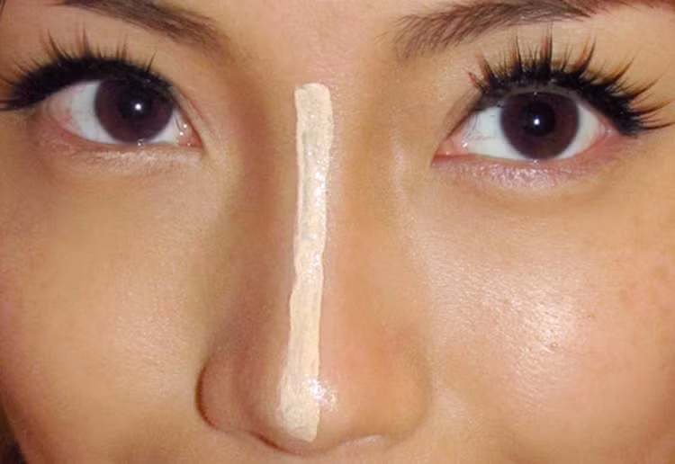 Lấy hai ngón tay xoa phấn đậm hơn dọc hai bên cánh mũi, đồng thời dùng bút che khiếm khuyết để che bớt những vùng da tối màu hoặc tấy đỏ ở vùng mũi. Sử dụng những tone màu tự nhiên, gần với màu da nhất để tạo khối cho mũi cao và thanh thoát tự nhiên.
