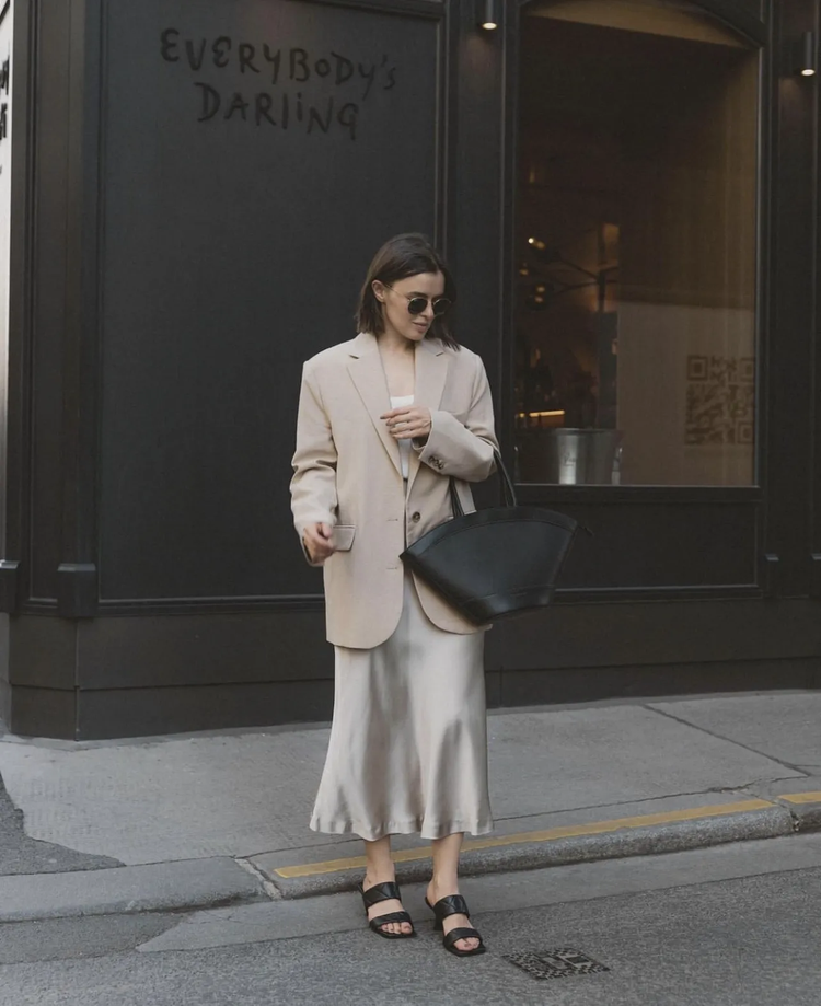 Không cần đến hàng hiệu, bạn có thể trở nên sang trọng nhờ cách phối màu sắc trang phục. Một trong những bộ đôi màu thể hiện cho nét thanh lịch và ấn tượng là be và ánh bạc. Khả năng kết hợp của màu be được đánh giá cao, mang đến sự tinh tế và táo bạo. Trong khi đó màu bạc được coi là một trong những xu hướng Thu đông 2023 lớn nhất, mang tới vẻ bóng bẩy. Để giảm bớt sự chú ý, bạn nên chọn quần hoặc chân váy ánh bạc, áo màu be.