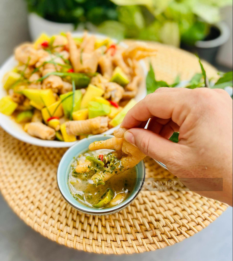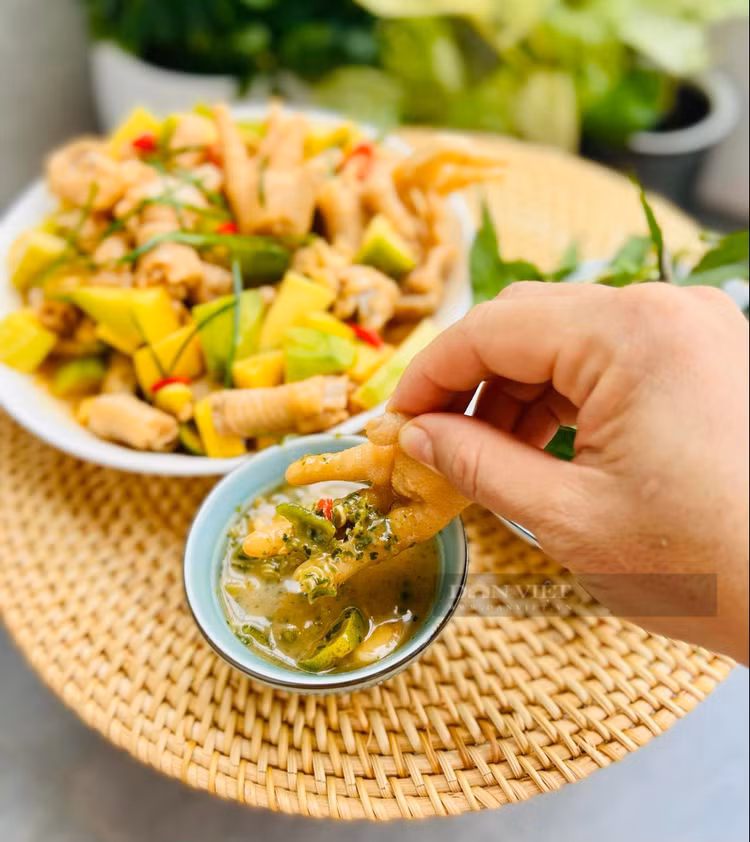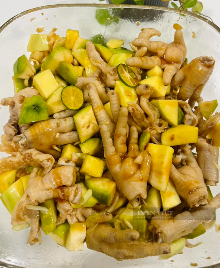 - Cóc và xoài bỏ vỏ cắt miếng vừa ăn, đổ vào thay chân gà, nước sốt nguội thì cho vào trộn đều, cắt thêm 5 trái tắc và 4 tép sả vào trộn cùng.