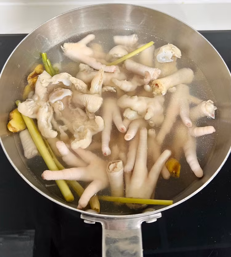 - Luộc chân gà với gừng và 3 cây sả, luộc 7-10 phút là chân gà chín, vớt ra thau nước có thêm đá lạnh vào, để chân gà giòn hơn, 5phut sau vớt ra cho ráo nước.